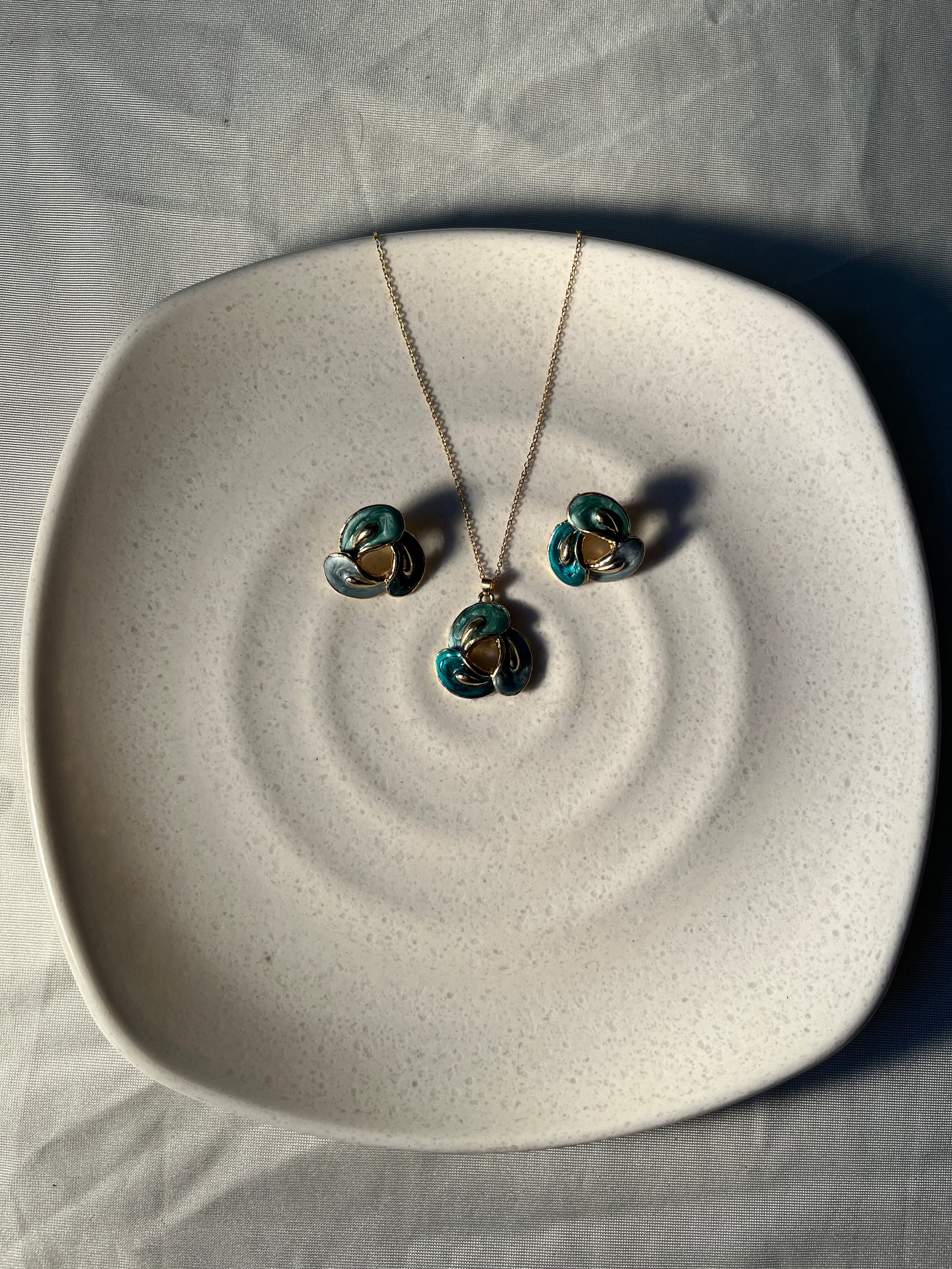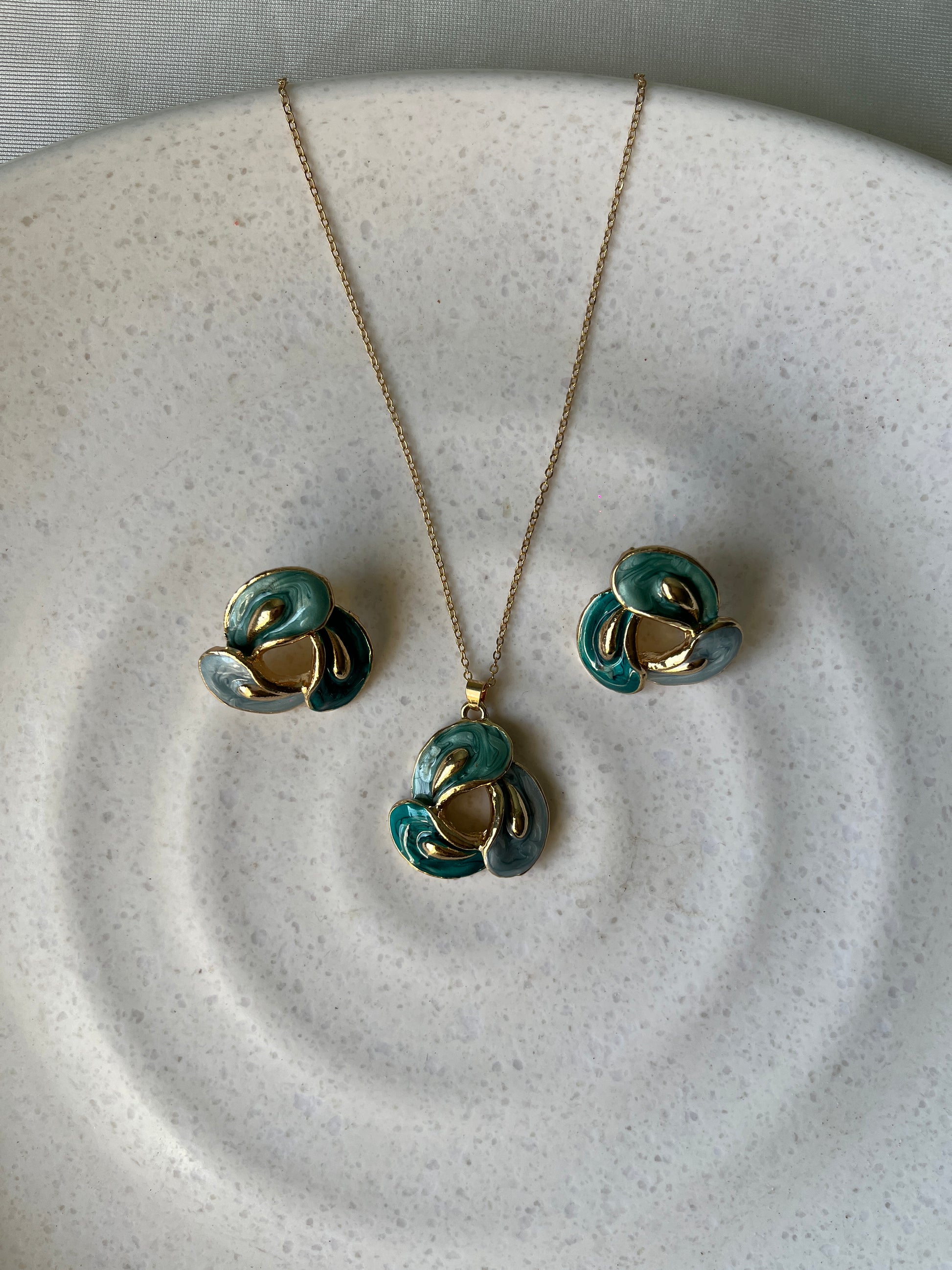 Add a touch of elegance to your look with our Emerald Swirl Enamel Jewelry Set. This stunning set includes a beautifully crafted pendant and matching earrings, designed with a unique swirl pattern in rich emerald and teal tones accented with golden borders. The artistic enamel finish creates a luxurious shine that complements both traditional and modern outfits. Perfect for festive occasions, parties, or everyday sophistication.